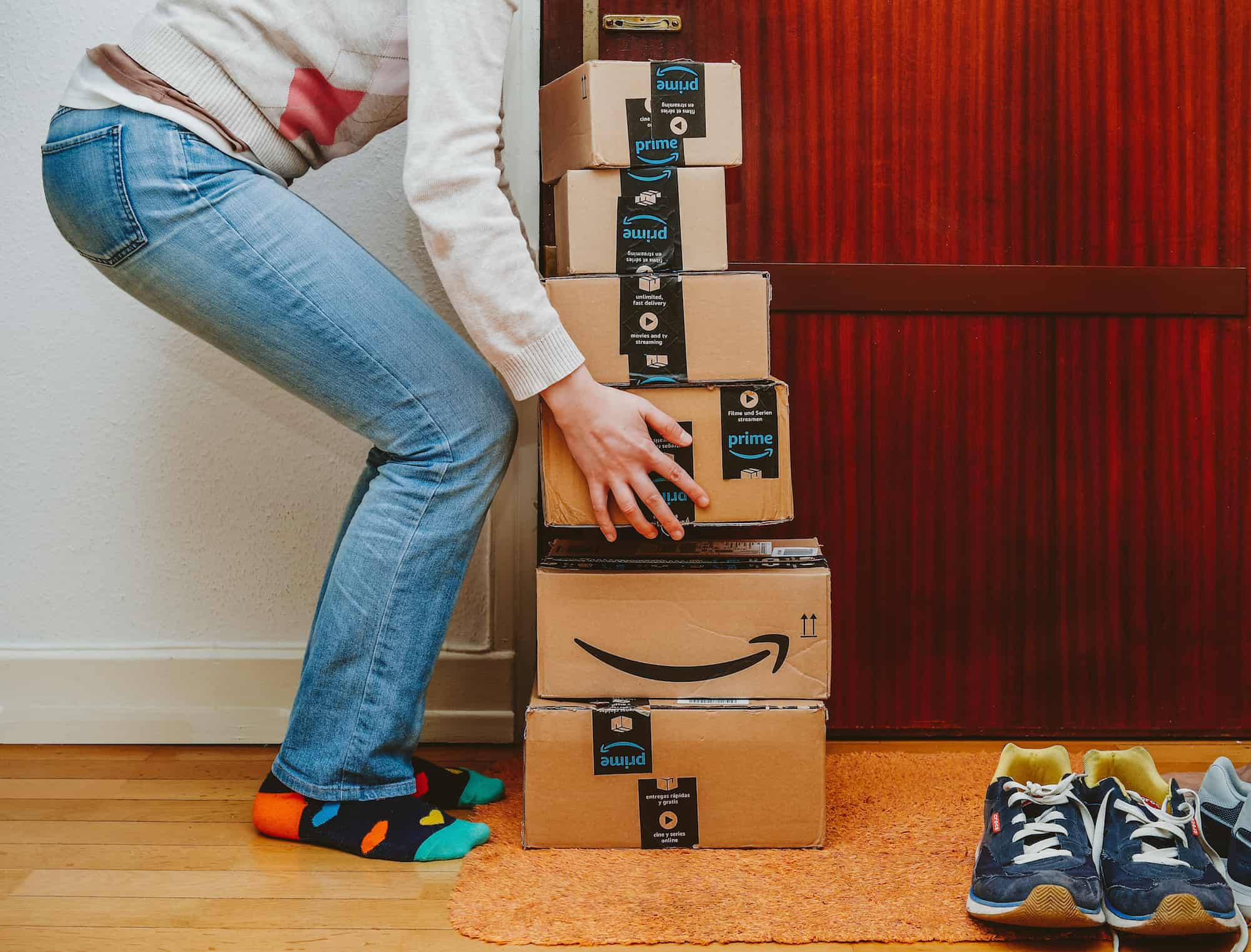 Woman lifting heavy Amazon Prime boxes during Prime Day offer sa – …